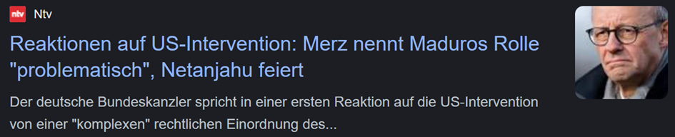 Sprachlich ist es jetzt schwierig für Medien, die richtige Wortwahl zu treffen, einfach weil Intervention ein Wort mit verschiedenen Gebrauchsweisen in unterschiedlichen Kontexten ist. Jedoch stünden andere Begriffe zur Wahl, um die Sachlage pointierter aber auch korrekter zu beschreiben. Jeder kann nun selbst testen: Welches Wort klänge in meinen Ohren am treffendsten für das, was die USA in Venezuela getan haben? Entführung, Kidnapping, Übergriff, Angriff, Intervention, Regime Change …